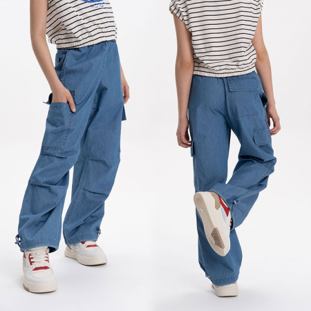 Состав: 100%хлопокОписание: Джинсовые брюки карго для девочек. Брюки свободного кроя с накладными карманами с клапанами и прорезными боковыми карманами. На спинке справа накладной карман с клапаном. Для придания объема в области коленки на переде заложены складки - модный тренд. По переду имитация гульфика. Внутри пояса шнур для регулировки по талии. По низу брюк предусмотрена регулировка ширины с помощью эластика и стоппера.