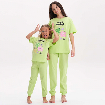 Состав: верх: 100%хлопок, низ: 100%хлопокОписание: Стильная и уютная пижама актуального цвета для девочки. В составе ткани 100% хлопка — идеально для детской одежды! Модель приятна на ощупь, прекрасно пропускает воздух, позволяя коже ребёнка дышать. При этом в пижаме из хлопка ребёнку будет тепло, даже если он сбросит одеяло. Всё это обеспечивает комфортный и качественный сон. Футболка и брюки среднего объёма, плечо немного спущено, рукава широкие и свободные — в пижаме очень удобно спать. Широкая и мягкая резинка в поясе не перекручивается и не давит. Манжеты брюк и отделка горловины из эластичной рибаны — она не растягивается, ребёнку удобно надевать и снимать пижаму. Футболку украшает позитивный принт. Надписи переводятся: "исследуй новые идеи", "создай немного искусства". Хлопковый комплект идеален для сна как дома, так и в детском саду — прекрасный выбор для вашего ребёнка! Пижама с брюками подходит для круглогодичного использования. Домашний комплект — замечательный подарок дочке, внучке, сестре на любой праздник. Выбирайте нужный размер по таблице размеров на фото. Цвет товара на экране вашего устройства может отличаться от цвета изделия вживую.