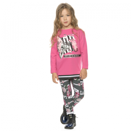 Состав: верх: 100%хлопок, низ: 95%хлопок 5%эластанОписание: Комплект для девочек: туника и лосины. Туника из футера умеренного объёма, рукав небольшого объема, слегка зауженный книзу, боковые швы переведены на перед, внизу с разрезами, по низу переда настрочена трикотажная тесьма, перепад длины переда и спинки, перевод Расслабься и послушай музыку. Классические лосины из футера с начесом.