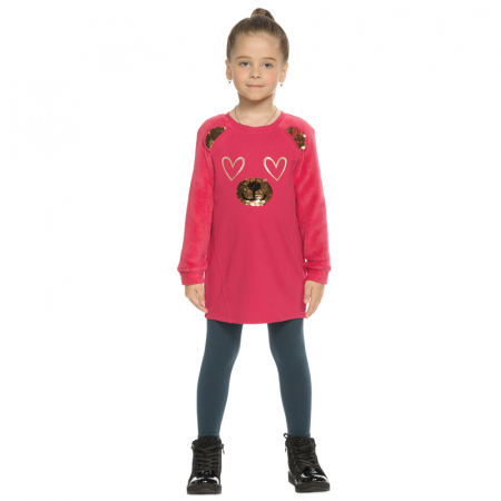 Состав: верх: 96%хлопок 4%эластан, вставка: 100%полиэстер, низ: 95%хлопок 5%эластанОписание: Комплект для девочек туника и лосины. Туника из футера с рукавами реглан из велсофта. На переде рельефные швы, создающие силуэт лёгкий бочонок. В швах рукава вшиты декоративные ушки, расшитые золотистыми пайетками. По переду принт из мягких стойких золотых сердечек и вышивки из пайеток, имитирующие мордочку медведя. Лосины из эластичного футера с начесом.