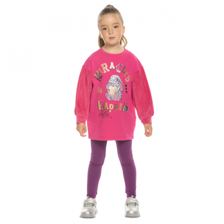 Состав: верх: 96%хлопок 4%эластан, вставка: 95%полиэстер 5%эластан, низ: 95%хлопок 5%эластанОписание: Комплект для девочек туника и лосины. Туника мягкого оверсайз силуэта со спущенной линией плеча. Перед и спинка из футера, рукава из мягкого плюшевого велюра с перламутровым отблеском. Эластичный rubber принт с золотым металликом и глиттером. Надпись Чудеса случаются. Вуаля. Низ Классические лосины из футера с начесом.