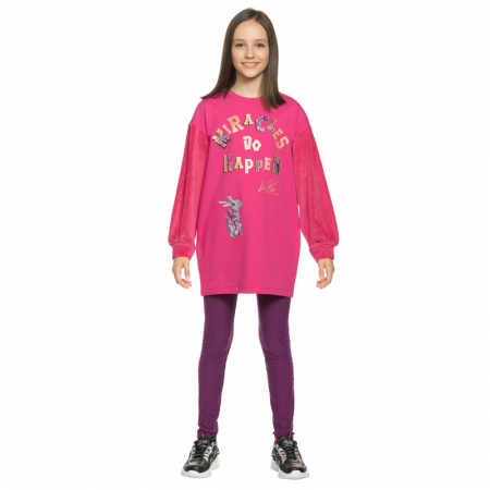 Состав: верх: 96%хлопок 4%эластан, вставка: 95%полиэстер 5%эластан, низ: 95%хлопок 5%эластанОписание: Комплект для девочек туника и лосины. Туника мягкого оверсайз силуэта со спущенной линией плеча. Перед и спинка из футера, рукава из мягкого плюшевого велюра с перламутровым отблеском. Эластичный rubber принт с золотым металликом и глиттером. Надпись Чудеса случаются. Вуаля. Низ Классические лосины из футера с начесом.
