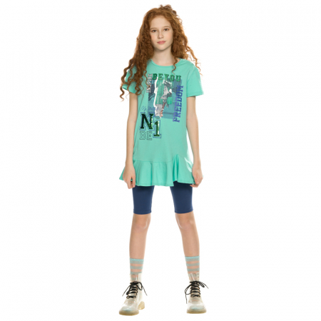 Состав: верх: 100%хлопок, низ: 95%хлопок 5%эластанОписание: Комплект для девочек туника и лосины. Туника с фигурной линией низа и притачным воланом. Необычный способ втачивания волана по переду волан втачивается в разрез, создавая интересные фалды. Силуэт прямой, свободный, с мягкой линией плеча. Фотопринт с разноцветным глиттером и вышивкой переливающимися переворачивающимися пайетками. Перевод Вдохновляю быть свободной , Будь первой , Мой стритстайл . Велосипедки длиной до колена.