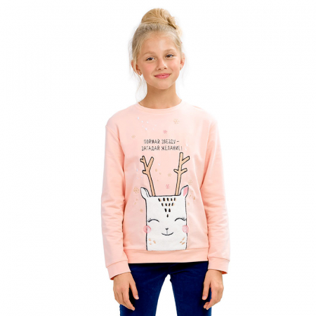 Состав: 96%хлопок 4%эластанОписание: Толстовка среднего объёма, со спущенным плечом. На передней части изделия пушистая аппликация в виде оленя, с обратной стороны которой водорастворимая пленка, и надпись "Поймай звезду - загадай желание!". Манжеты из основной ткани на рукавах и по низу изделия.