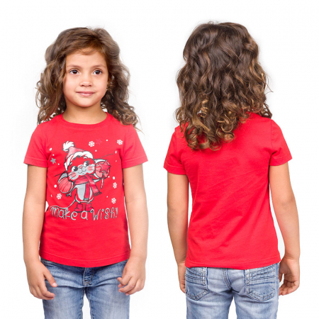 Состав: 100%хлопокОписание: Футболка для девочек. Футболка умеренного объёма. Центральный принт с разноцветным глиттером в виде символа года мышонка и надпись. Перевод надписи «Загадай желание!».