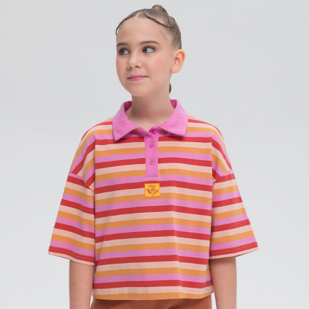 Состав: 100%хлопокОписание: Кроп-топ (поло) оверсайз-силуэта для девочки. Кроп-топ — один из актуальных летних трендов. Модель со спущенным плечом и удлинённым рукавом выполнена из трикотажного полотна в яркую вытканную горизонтальную полоску. Это не принт, полоски не поблёкнут от многочисленных стирок. Состав ткани — хлопок 100%. Благодаря этому поло мягкое, комфортное и приятное на ощупь. Практичный оверсайз-силуэт позволит носить топ продолжительное время. Даже если ребёнок заметно подрастёт, он не станет малым. Модель украшена симпатичной и приятной на ощупь резиновой нашивкой под планкой с пуговицами. Кроп-поло отлично сочетается с шортами и леггинсами.