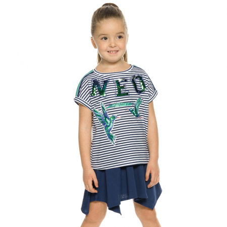 Состав: верх: 100%хлопок, низ: 60%хлопок 40%полиэстерОписание: Комплект для девочек футболка и юбка. Футболка свободного объёма с цельнокроеным рукавом с отгибающейся закрепленной манжетой. Вдоль линии плеч настрочена декоративная трикотажная тесьма. По переду изделия принт с разноцветным глиттером в виде птичек колибри и надписи, перевод Блестящее будущее , и вышивка из переливающихся переворачивающихся пайеток. Юбка - Новинка. Прямоугольная юбка с фигурной угловатой линией низа, пояс на широкой внутренней резинке.
