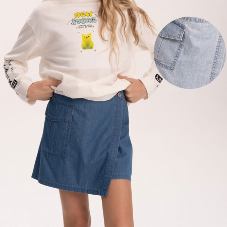 Состав: 100%хлопокОписание: Юбка-шорты из тонкой джинсы. Шорты с запахом, имитирующим юбку. На передней отлетной части отрезной пояс, фиксирующийся на пуговицу, на правой половине накладной карман. По спинке пояс на резинке, что обеспечивает легкость при надевании.