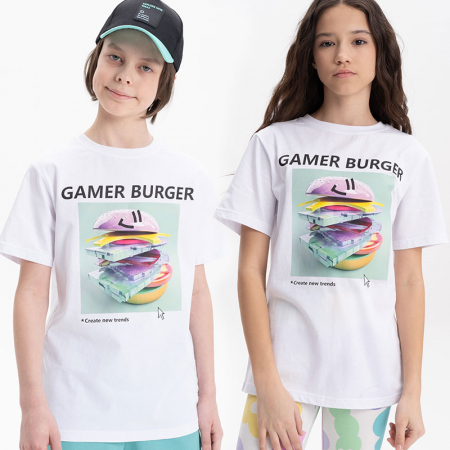 Состав: 100%хлопокОписание: Футболка для мальчика и девочки прямого кроя - это идеальный выбор для активного ребенка. Вырез горловины обработан эластичной тканью — она прекрасно держит форму, не растягивается, при этом ребёнку удобно надевать и снимать футболку. Изделие неприхотливо в уходе. Футболка летняя с принтом и надписями в стиле Digital. Перевод надписей: "gamer burger" - геймерский бургер, "create new trends" - создавай новые тренды. Яркая спортивная футболка подходит как для подростков так и для малышей в детский сад. Подходит для любого времени года.