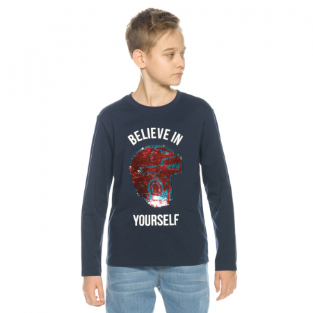 Состав: 60%хлопок 40%полиэстерОписание: Джемпер для мальчиков. Лонгслив умеренного объёма. Впервые аппликация из переворачивающихся пайеток в виде хоккейного шлема и надпись Верь в себя.
