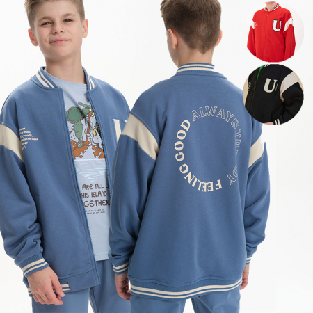 Состав: 87%хлопок 13%полиэстерОписание: Бомбер для мальчика – трикотажная модель свободного кроя на позднюю весну, лето. Куртка-бомбер выполнена из плотного футера-петля с высоким содержанием хлопка. Воротник, манжеты по рукавам и низу изделия - из декоративной рибаны. На рукавах вставки из основного материала контрастного цвета. Боковые карманы расположены на переде под наклоном. Толстовка для мальчика украшена модным университетским шрифтом с засечками. Перед декорирован нашивкой – объемной мягкой аппликацией из бербер-флиса (барашек) и графичной шрифтовой композицией. Меховая нашивка буквой "U": unity – перевод "единство, командная сплоченность". Надпись: "Be present, listen to music, be with you BF, do things that make you happy #enjoy!" - перевод "Живи в моменте, слушай музыку, встречайся со своим лучшим другом, делай то, что делает тебя счастливым #наслаждайся!". На спине круговая шрифтовая композиция: "Feeling good always trendy" - перевод "Хорошее настроение всегда в тренде (модно)". Бомбер школьный представлен в размерах, которые подойдут как для малышей так и для подростков. Цвет товара на экране вашего устройства может отличаться от цвета изделия вживую.