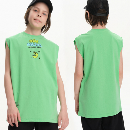Состав: 100%хлопокОписание: Летняя майка для мальчика свободного силуэта. Выполнена из 100% хлопка. Горловина из рибаны - голова не застрянет. По переду украшена ярким принтом с персонажем из игры Pac-man (пакмен) с надписями. Перевод надписей: "new online" - новый онлайн, "choose your player" - выбери своего игрока, "create your reality" - создавай свою реальность. Футболка без рукавов отлично подойдет для занятий спортом, походов на пляж и прогулок.