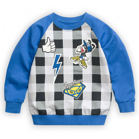 Состав: 100%хлопокОписание: Толстовка для мальчиков. Толстовка свободного силуэта, рукав реглан, горловина, манжета рукава и низ изделия из рибаны, по переду изделия принт клетка с имитацией нашивок