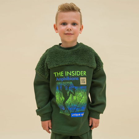 Состав: 60%хлопок 40%полиэстер, вставка: 100%полиэстерОписание: Свитшот детский для мальчика. Свободный джепер со спущенным плечом подарит ребёнку комфорт и не будет стеснять его движений. Объёмная толстовка выполнена в сочетании двух материалов: футера с начёсом и мягкого бербер-флиса (фактура «барашка») на кокетке переда и спинки. Комбинация материалов разной фактуры — актуальный модный тренд. Манжеты и отделка горловины выполнены из эластичной рибаны. Она не растягивается, прекрасно сохраняет форму, при этом ребёнку удобно надевать и снимать свитшот. За толстовкой просто ухаживать. Свитшот с принтом по переду выполнен из ткани с высоким содержанием качественного хлопка — он мягкий, тёплый и хорошо пропускает воздух. Полиэстер помогает сохранить цвет и первозданный внешний вид надолго. Оригинальный принт в виде лягушки с надписями «инсайдер амфибия» и «уникальный вид» дополнен QR-кодом, при сканировании которого можно прочитать уникальные научные факты о лягушках. Принт эластичный и прочный, не боится частых стирок. Свитшот с начёсом выполнен в универсальном цвете хаки. В линейке представлены следующие размеры: 1 (86): 2 (92): 3 (98): 4 (104): 5 (110): 6 (116): 7 (122): 8 (128): 9 (134): 10 (140): 11 (146). Оверсайз-свитшот подходит как для маленьких мальчиков, так и для подростков. Его можно носить круглый год: осенью и весной (демисезон), зимой, в прохладную погоду летом. Толстовка идеальна для детского сада, прогулок, активного отдыха, дома. Детский свитшот — отличный подарок сыну, брату, внуку или племяннику на Новый год и любой другой праздник.