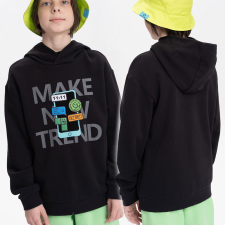 Состав: 87%хлопок 13%полиэстерОписание: Худи для мальчика без начеса – актуальная вещь в любом сезоне, будь то весна, лето или осень. Кофта спортивная для мальчика выполнена из плотного футера-петля, который отлично согревает в прохладную погоду и при этом хорошо пропускает воздух – ребенок активно двигается, играет, не потеет. Толстовка свободного покроя оверсайз со спущенным плечом, углубленной проймой. Рукава а также низ изделия на манжете из рибаны. Кофта без карманов. Капюшон объемный, двухшовный без регулировки. Изделие выполнено в актуальном стиле Digital и понравится юным геймерам, а также любителям одежды в корейском стиле и в стиле аниме. Пайта в базовом цвете украшено нашивкой-липучкой со съемными стикерами. По переду текстовый принт. Перевод принта "make new trends" - делай новые тренды. Размерный ряд подходит как для малышей так и для подростков.