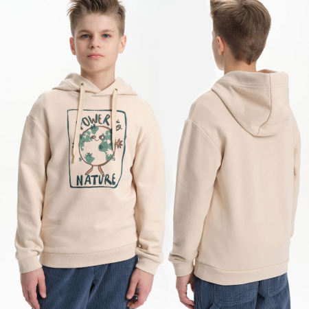Состав: 87%хлопок 13%полиэстерОписание: Худи для мальчика без начеса – актуальная вещь в любом сезоне, будь то весна, лето или осень. Кофта спортивная для мальчика выполнена из плотного футера-петля, который отлично согревает в прохладную погоду и при этом хорошо пропускает воздух – ребенок активно двигается, играет, не потеет. Толстовка свободного покроя оверсайз со спущенным плечом, углубленной проймой. Рукава а также низ изделия на манжете из рибаны. Кофта без карманов. Капюшон на запахе со шнурками для регулировки. Пайта для мальчика украшена по переду выпуклым резиновым принтом, а также надписью. Перевод принта "power to nature" - власть природе. Размерный ряд подходит как для малышей так и для подростков.