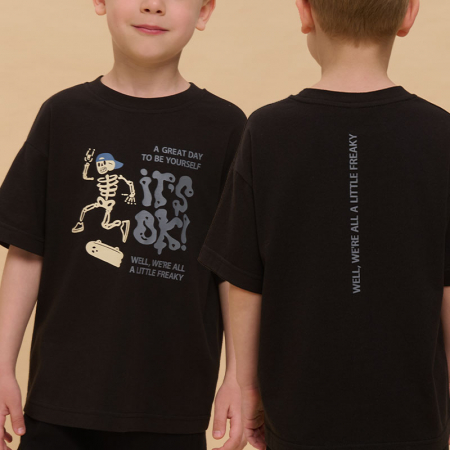 Состав: 100%хлопокОписание: Детская футболка для мальчика. Комфортная майка умеренного оверсайз-объёма со спущенным плечом подарит ребёнку свободу движений. Вырез горловины обработан эластичной рибаной (ткань в рубчик) — она отлично держит форму, не растягивается, при этом ребёнку удобно надевать и снимать футболку. Изделие неприхотливо в уходе. Футболка детская с принтом в актуальном готическом стиле. Надписи переводятся: «хороший день, чтобы быть собой», «всё окей!», «все мы немного странные». Принт эластичный и устойчивый, хорошо переносит многочисленные стирки. Фишка модели — принт светится в темноте! Это не оставит равнодушным ни одного ребёнка! В составе ткани 100% хлопка — майка мягкая, воздухопроницаемая, приятная на ощупь. Футболка для мальчиков выполнена в универсальной расцветке, её легко сочетать с различными брюками, джинсами. Детские футболки с принтом подходят как для маленьких мальчиков, так и для подростков. Оверсайз-футболка для мальчика подходит для любого времени года, её можно носить как летом, так и в холодное время года в качестве среднего слоя одежды. Помните о правильном уходе за изделием: рекомендуется стирать при температуре не выше 30 °C, без предварительного замачивания, с изнанки. Это поможет сохранить качество и цвет футболки на длительное время. Не забывайте о выборе правильного размера. Используйте таблицу размеров на фотографии, чтобы выбрать подходящий вариант для вашего мальчика. Обратите внимание, что цвет товара на экране вашего устройства может отличаться от реального.