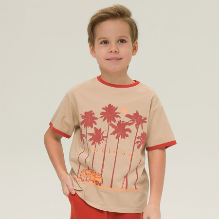 Состав: 100%хлопокОписание: Удлинённая футболка оверсайз-силуэта для мальчика. 100% хлопка в составе — ткань мягкая, дышащая и приятная на ощупь. Оверсайз-силуэт со спущенным плечом не сковывает движений ребёнка и позволяет ему быть активным. А ещё такой футболки хватит надолго! Малыш растёт, а она не становится малой. Модель декорирована позитивным принтом с летним настроением. По горловине и рукавам контрастная отделка в стиле 1970-х — актуальный тренд. Эта футболка станет отличным дополнением гардероба маленького модника.