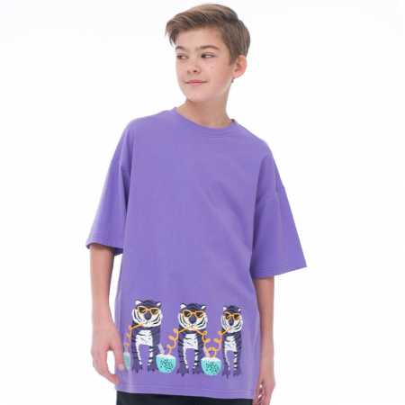 Состав: 100%хлопокОписание: Удлинённая футболка оверсайз-силуэта для мальчика. Модель со спущенным плечом и классическим округлым вырезом горловины украшает забавный принт в виде трёх тигров. Он устойчив к частым стиркам. В составе ткани 100% хлопка — изделие приятное на ощупь и очень комфортное для ребёнка. Яркий фиолетовый цвет выделит вашего ребёнка из толпы. Вы не потеряете его в местах большого скопления людей. Оверсайз-силуэт позволит носить футболку продолжительное время. Она будет словно "расти" вместе с ребёнком. Эта модель идеальна для прогулок и занятий спортом.