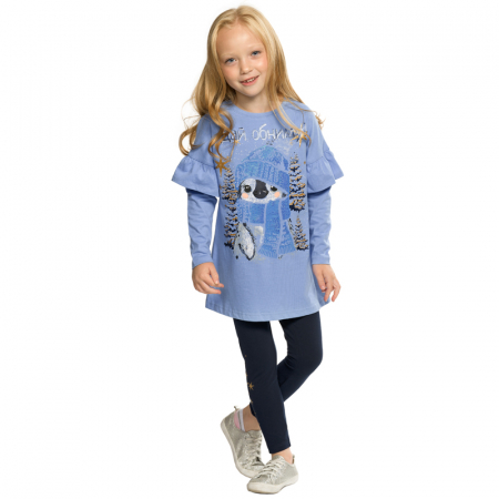 Состав: верх: 100%хлопок, низ: 95%хлопок 5%эластанОписание: Комплект для девочек туника и лосины. Туника НОВИНКА легкого А силуэта, с низко опущенной линией плеча и длинным рукавом. Шов втачивания рукава декорирован воланом из основной ткани. Rubber принт с огромным количеством золота и разноцветного глиттера. Классические лосины с принтом из золотистых звезд.