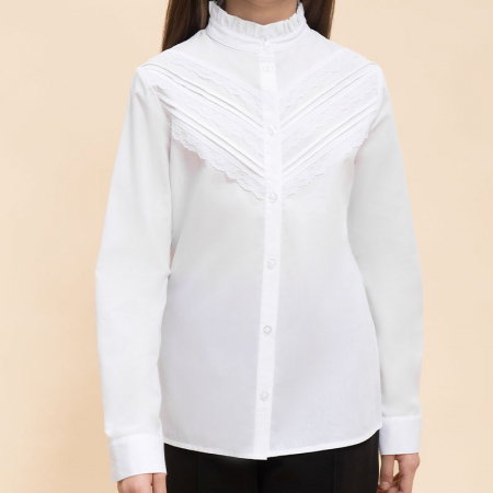 Состав: 60%хлопок 40%полиэстерОписание: Блузка классическая полуприлегающего силуэта с рельефами на спинке для девочки. Школьная блузка не сковывает движений ребёнка. Перед украшают застроченные по диагонали защипы и тонкое изящное кружево — нежные винтажные мотивы. Модель дополнена длинными рукавами небольшого объема на манжете с застежкой. Аккуратный изящный воротник-стойка с кружевом придаёт изделию изюминку и женственность. В составе ткани преобладает высококачественный хлопок, обеспечивающий отличную воздухопроницаемость и комфорт. Благодаря полиэстеру блузка в школу для девочки прекрасно сохраняет форму и первозданный внешний вид даже после многократных стирок. Для школьных рубашек мы используем сорочечную ткань, плотностью 100гр/м2. Модель однотонная, без принта. Блузка белая для девочки — это универсальный вариант, который легко сочетается с различными брюками, юбками и сарафанами, позволяя создавать разнообразные образы для разных случаев. Блузка детская — отличный выбор школьной формы для вашей девочки. Помните о правильном уходе за изделием: рекомендуется стирать при температуре не выше 30 °C, без предварительного замачивания, с изнанки. Это поможет сохранить качество и цвет блузки на долгое время. Не забывайте о выборе правильного размера. Используйте таблицу размеров на фотографии, чтобы выбрать подходящий вариант. Обратите внимание, что цвет товара на экране вашего устройства может отличаться от реального.