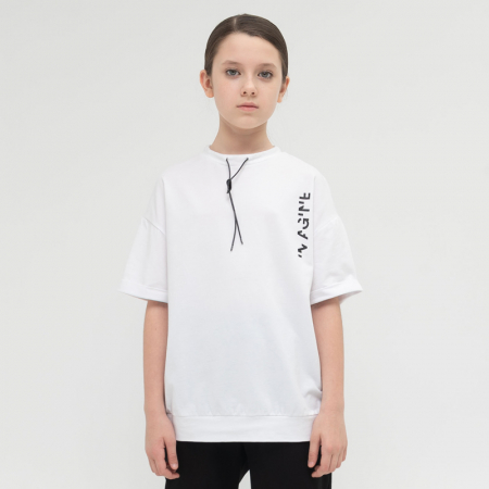 Состав: 93%хлопок 7%эластанОписание: Футболка школьная. Унисекс. Прямой силуэт, спущенное плечо, свободный рукав не стесняют движения. А широкая горловина с эластичным шнуром и фиксатором легко отрегулирует объем. На переде минималистичный локальный принт Imagine (Воображай). Хлопковый трикотаж с небольшим содержанием эластана не растянется и даст телу дышать. Практичен, легко стирается и не теряет цвет. Отвечает современным тенденциям и прекрасно подойдёт для школы и для расслабленных образов.