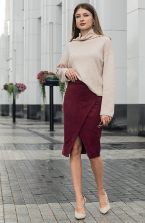 Юбка "карандаш" из трикотажной ткани "эко-замша". Верх юбки обработан поясом. Спереди юбка выполнена "на запах" и имеет оригинальный разрез. Застежка на потайную молнию в среднем шве спинке.