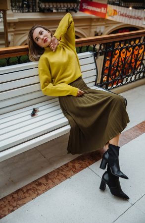 Юбка на поясе со складками "гофре" из трикотажного "крепа". Юбка имеет форму "полусолнце". Застежка на потайную молнию в среднем шве спинке. Длинна юбки "миди".