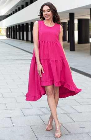 Коктейльное платье свободного силуэта. Платье имеет два подреза с густой сборкой. Лиф платья двухслойный с нагрудной вытачкой. В среднем шве спинке на кокетке разрез и застежка на пуговицу. Платье ассиметричное: спереди короче, чем сзади. Низ платья обработан эффектным воланом со сборкой.