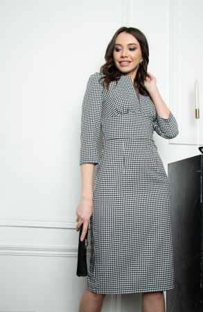 Платье "футляр" прилегающего силуэта из качественной костюмной ткани с принтом «гусиная лапка» или pied-de-poule. На полочке и спинке широкий отрезной пояс. Под грудью для идеальной посадки расположена сборка. Вырез горловины глубокий. Застежка на потайную молнию в боковом шве. В среднем шве спинке расположена шлица. Рукав втачной длинной 3/4 "фонарик".