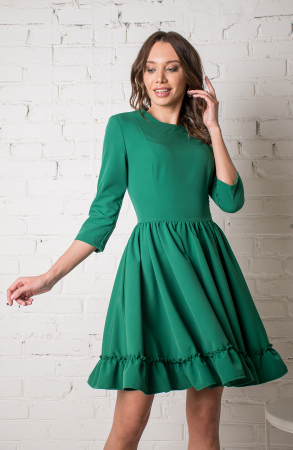 Коктейльное платье выполнено из приятной костюмной такни «гальяно». Платье отрезное по линии талии. На спинке и спинки лифа введены рельефы. В среднем шве - застежка на потайную молнию. Вырез горловины круглый не глубокий. Юбка "солнце" с воланом по низу. Рукав втачной, длинной 3/4.