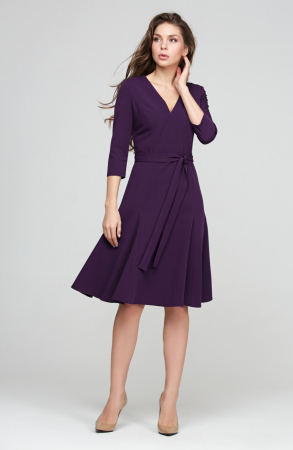 Романтичное платье выполнено из ткани «гальяно». На спинке средний шов и застежка на потайную молнию. Рукав узкий длинной 3/4. Лиф платья выполнен назапах, благодаря чему образуется глубокий V-образный вырез декольте. Юбка платье имеет форму «годе». Платье дополнено поясом из той же ткани.
