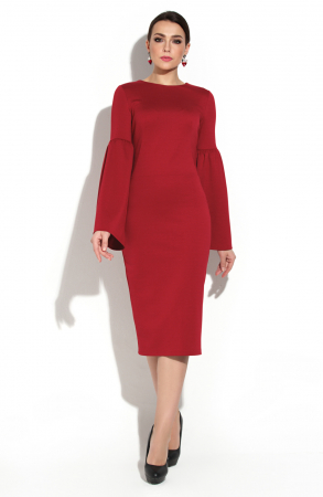 Платье футляр отрезное по линии талии. Силуэт лифа, достигнут благодаря косым нагрудным вытачкам. Вырез горловины круглый не глубокий. Рукав втачной, широкий внизу, над линией локтя рукав имеет подрез и сильно присборен. На спинке в среднем шве застежка на потайную молнию и шлица. Силуэт платья придает женской фигуре изящности, визуально делая ее стройнее.