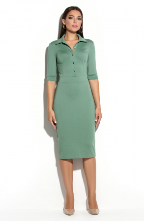 Платье-футляр полуприлегающего силуэта. Данная модель платья выполнена из плотного трикотажа «джерси». По линии талии введен не широкий отрезной пояс. На полочке расположена планка с застежкой на металлические пуговицы. Силуэт платья достигнут благодаря рельефам на спинке и полочке. Горловина платья обработана отложным воротником. Спинка со средним швом и шлецей в нем. Рукав втачной 3/4, по низу обработан манжетой. Дизайн пуговиц может незначительно отличаться от изображения на фото.