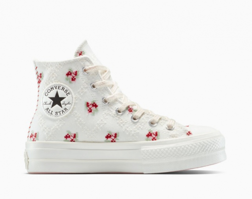 Braided laces and floral cross stitch embroidery brings a crafted, DIY look