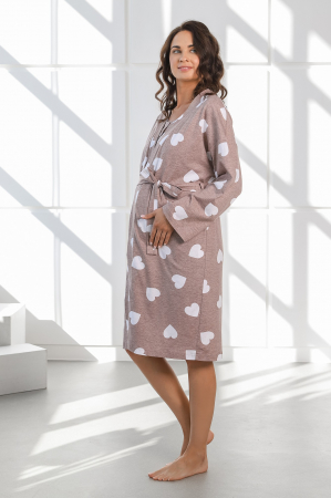 Халат из трикотажного полотна кулирного переплетения, на запах, с длинными рукавами. По линиям борта и горловине притачная планка. Съёмный пояс фиксируется на линии талии при помощи двух шлёвок в боковых швах.