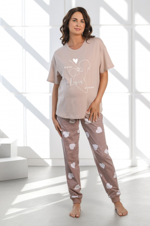 Костюм для беременных и кормящих женщин. Футболка со спущенной линией плеч, свободная, А-силуэта, с принтом. Брюки с заниженной спереди линией талии, с манжетами из кашкорсе.