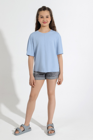Футболка для девочек модной объемно-силуэтной формы, с вертикальным отстроченным швом по центру переда. На рукавах также выполнены декоративные вертикальные отстроченные швы и глубокие защипы по низу.