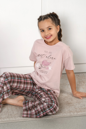 Костюм из хлопковых полотен кулирного переплетения. Футболка из однотонного полотна, с милым принтом, с короткими рукавами, спущенной линией плеч. Брюки с набивным рисунком эксклюзивного дизайна, расширенные к низу, с боковыми карманами, на притачном поясе с отстроченной эластичной тесьмой.
