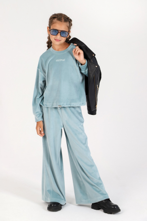 Костюм для девочки из трикотажного полотна "велюр", состоящий из джемпера и брюк. Джемпер свободного покроя модного силуэта: слегка расширенный и укороченный по длине, с втачными длинными рукавми на притачных манжетах, заниженными проймами и горловиной овальной формы, обработанной втачной планкой. В центре переда ниже горловины настрочен декоративный элемент прямоугольной формы. Брюки - свободного покроя, расширенные книзу, на притачном поясе с эластичной тесьмой внутри и карманами в боковых швах.