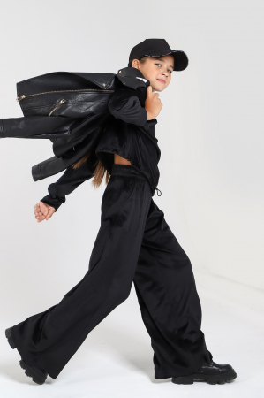 Костюм для девочки из трикотажного полотна "велюр", состоящий из джемпера и брюк. Джемпер свободного покроя модного силуэта: слегка расширенный и укороченный по длине, с втачными длинными рукавми на притачных манжетах, заниженными проймами и горловиной овальной формы, обработанной втачной планкой. В центре переда ниже горловины настрочен декоративный элемент прямоугольной формы. Брюки - свободного покроя, расширенные книзу, на притачном поясе с эластичной тесьмой внутри и карманами в боковых швах.