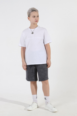 Шортыдля мальчика из трикотажного полотна "футер-трехника -петля", на притчном поясе с эластичной тесьмой внутри, с карманами в боковых швах и имитацией застежки "гульфик". В центре пояса - две обметанные петли, чере которые продет шнурок с наконечниками для регулирования степени прилегания шорт по талии.