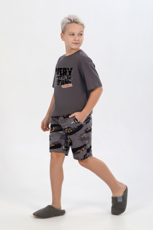 Костюм для мальчика ,состоящий из футболки и шорт. Футболка - из гладкокрашеного полотна "кулирка", классического покроя, с короткими втачными рукавами, горловиной овальной формы, обработанной втачной планкой, и принтом вцентре переда, выполненным в технике шелкографии. Шорты - из полотна с набивным рисунком, удлиненные, на притачном поясе с эластичнойтесьмой внутри и карманами в боковых швах, входы в которые окантованы основным материалом.