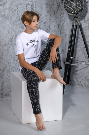 Костюм для мальчика, из хлопчатобумажных трикотажных полотен кулирного переплетения. Однотонная футболка со слегка спущенной линией плеч, округлым вырезом горловины, с принтом. Брюки из полотна с набивным рисунком эксклюзивного дизайна, прямые, на притачном поясе с отстроченной эластичной тесьмой, с боковыми карманами.