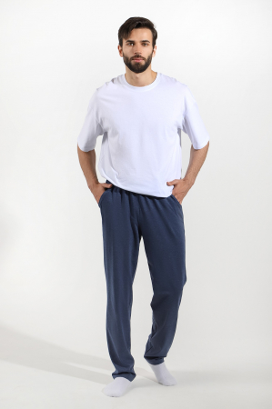 Брюки мужские из меланжированного трикотажного полотна "кулирка", прямого силуэта, с карманами в боковых швах, на притачном поясе с эластичной тесьмой внутри. В центре пояса - две обметанные петли , через которые продет шнурок для регулирования степени прилегания шорт по талии.