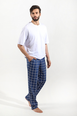 Брюки из полотна с набивным рисунком, классического покроя, прямые, на притачном поясе с эластичной тесьмой внутри, с карманами в боковых швах. Входы в карманы окантованы основным материалом.