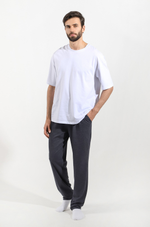 Брюки мужские из меланжированного трикотажного полотна "кулирка", прямого силуэта, с карманами в боковых швах, на притачном поясе с эластичной тесьмой внутри. В центре пояса - две обметанные петли , через которые продет шнурок для регулирования степени прилегания шорт по талии.