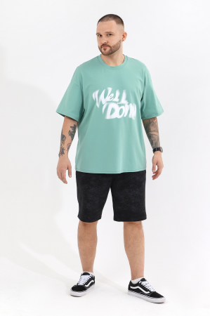 Футболка мужская оверсайз из трикотажного полотна: хлопкового с добавлением лайкры. Модель с принтом на переде, спущенной линией плеч, рукавами длиной до локтя.