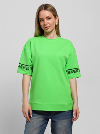 Футболка женская из гладкокрашенного трикотажного полотна «кулирка с лайкрой», свободного покроя, со спущенным плечом и втачными рукавами длиной до локтя, горловиной овальной формы, обработанной втачной планкой, на полочке выполнена вышивка. В нижней части боковых швов – разрезы.