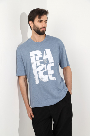 Футболка мужская из меланжированного трикотажного полотна "кулирка", свободного покроя, со спущенным плечом и втачными короткими рукавами. Горловина овальной формы обработана втачной планкой. По шву втачивания планки настрочена двойная отделочная строчка. В центре переда - принт, выплненный в технике шелкографии.